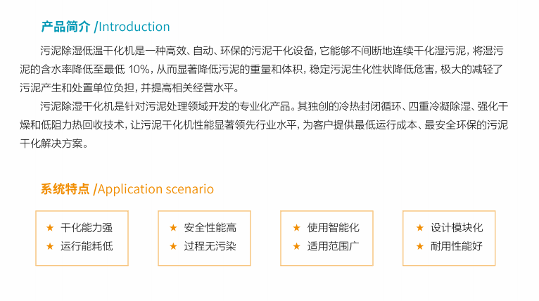 污泥除濕干化機(jī)是針對(duì)污泥處理領(lǐng)域開(kāi)發(fā)的專(zhuān)業(yè)化產(chǎn)品。其獨(dú)創(chuàng)的冷熱封閉循環(huán)、四重冷凝除濕、強(qiáng)化干燥和低阻力熱回收技術(shù),讓污泥干化機(jī)性能顯著領(lǐng)先行業(yè)水平,為客戶(hù)提供最低運(yùn)行成本、最安全環(huán)保的污泥干化解決方案。